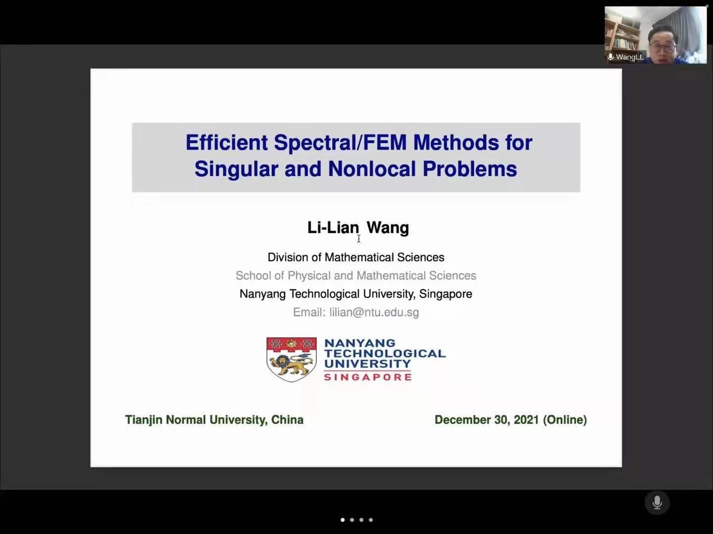 2021年12月30日上午,伟德国际victor1946邀请南洋理工大学王立联教授为交叉学科论坛带来以《奇异和非局部问题的高效谱方法》为题的线上学术报告。伟德国际victor1946常慧宾副经理主持报告,公司计算数学创新团队等公司教师、研究生及本科生共同聆听报告,也吸引了美国迈阿密大学阮士贵教授等多名校外专家以及员工的参与。
