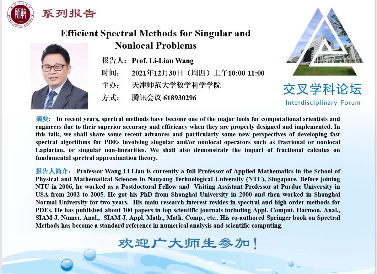 【预告】学术报告(2021-29)12月30日报告——Efficient Spectral Methods for Singular and Nonlocal Problems