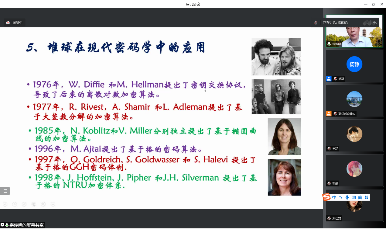 报告从堆球理论的起源谈起,从1954年如何解决装炮弹最多的问题,讲到堆球理论发展过程中几个主要问题和关键原理,如:开普勒猜想、牛顿问题、高斯的贡献、希尔伯特第十八问题等。介绍完堆球理论的主要历史发展脉络及主要思想后,报告阐述了堆球在信息论、现代密码学中的应用,特别是关于Shor,Ajtai, Pipher等人进行的抗量子攻击密码体系的研究。报告联系当前研究热点,拓展了师生的研究视野,激发了师生的浓厚兴趣。