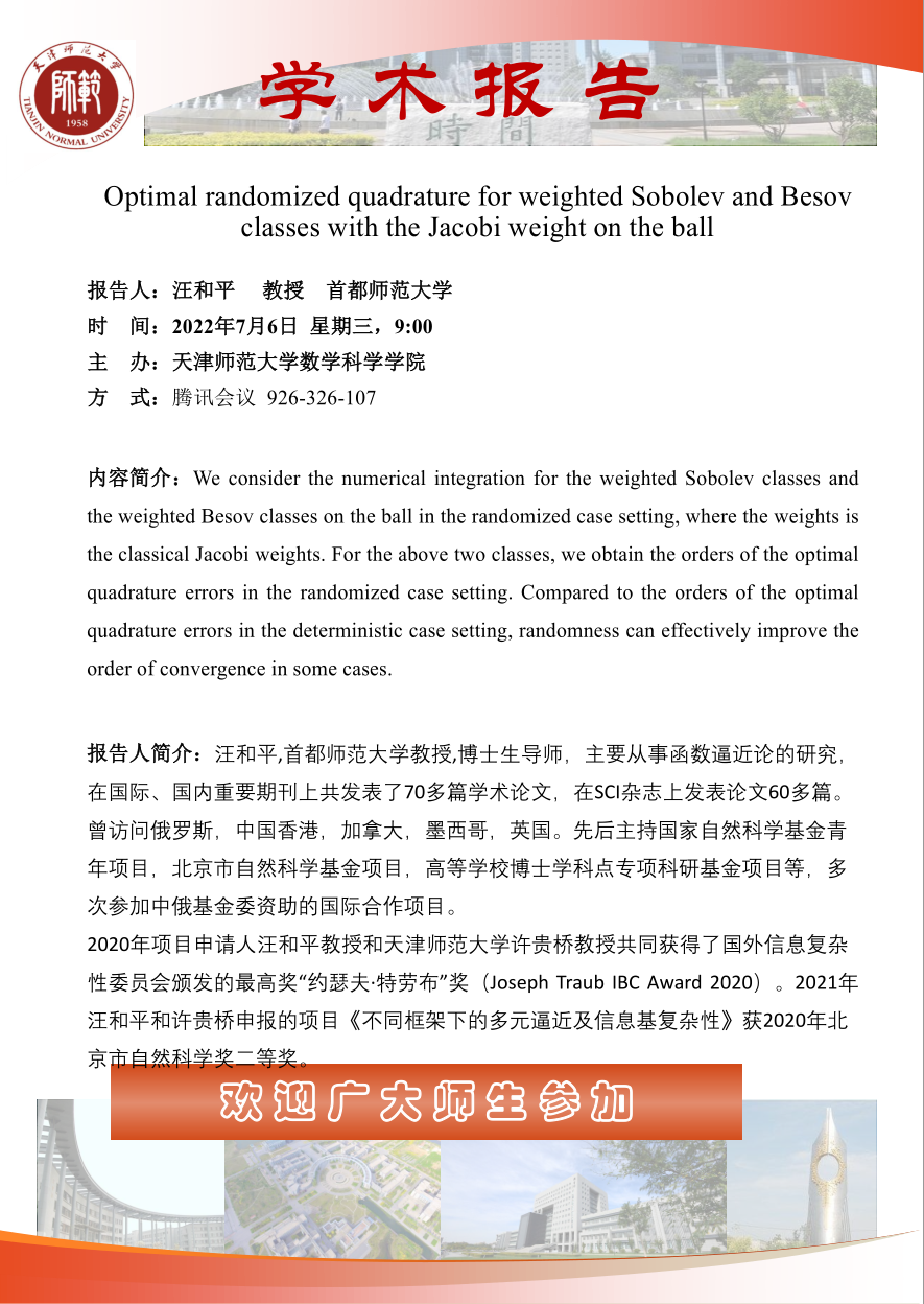 【预告】学术报告(2022-11)7月6日报告--Optimal randomized quadrature for weighted Sobolev and Besov classes with the Jacobi weight on the ball