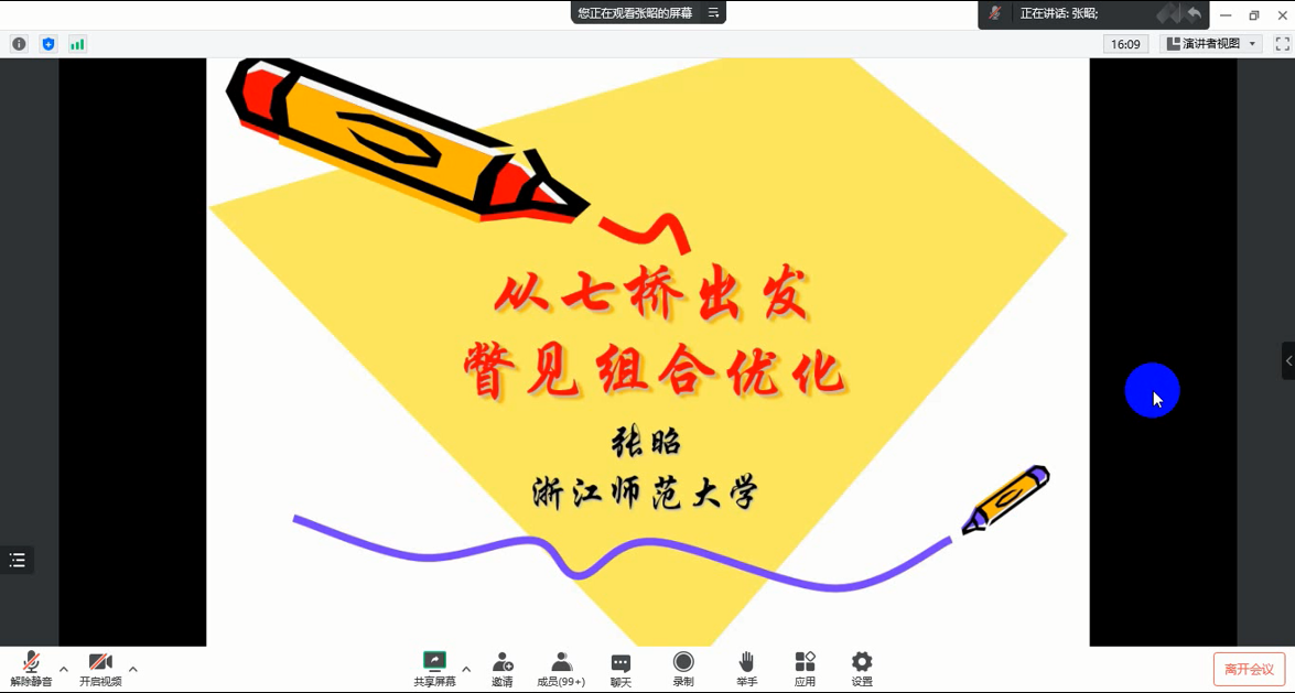 2023年1月9日下午3时,伟德国际victor1946在线上进行了“数学前沿论坛”系列的2023年首场报告。浙江师范大学张昭教授受邀为公司师生带来了题为《从七桥出发,瞥见组合优化》的线上学术报告。公司白学军副董事长和常慧宾副经理主持报告,赵春经理等公司领导、教师、研究生及本科生共140余人共同聆听本场报告。