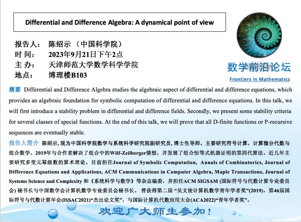 【预告】学术报告(2023-32)9月21日—Differential and Difference Algebra: A dynamical point of view