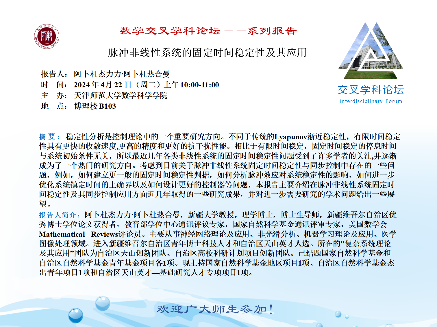 【预告】学术报告(2025-8)4月22日——脉冲非线性系统的固定时间稳定性及其应用