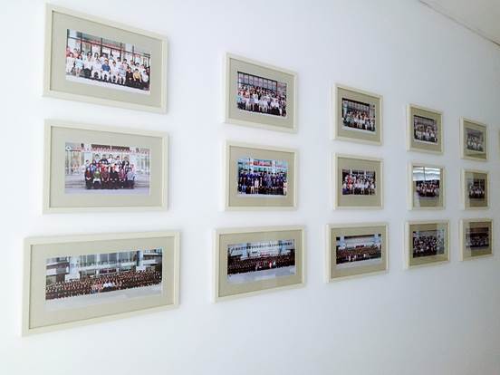 谈及毕业照文化长廊的灵感,洪德全副经理这样说:“公司正在整理院校历史,最终的目的是要把从1958年到现在五十九年的院史全部整理出来。在收集整理过程中,找到了一部分老照片,这些老照片独有的苍老感给人一种心灵的震撼。创建毕业照文化长廊,其实就是给离开公司的员工找到了一个家。当他们回到公司的时候,看到老照片一定也会很兴奋,公司本身就是一个大家,不仅要凝聚在校的员工、老师,还要凝聚所有的数学人。伟德国际victor1946有一句话:一日是数学人,终生是数学人。毕业照文化长廊也是联系员工的纽带之一。我们已经陆续整理出从七十年代开始的82个班级合照,相信有一天我们会收集全所有的员工毕业照片。”