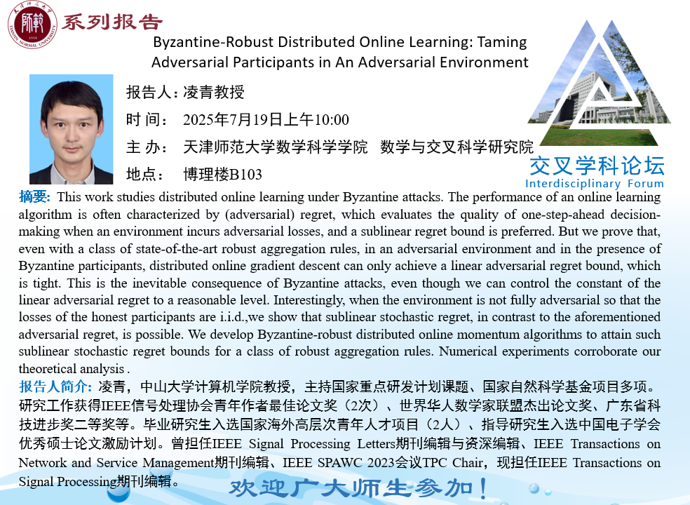 【预告】学术报告(2025-12)7月19日--Byzantine-Robust Distributed Online Learning:TamingAdversarial Participants in An Adversarial Environment